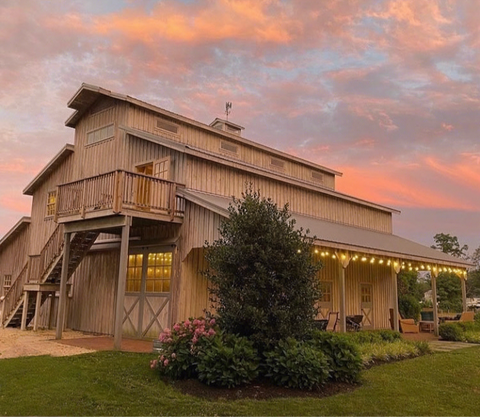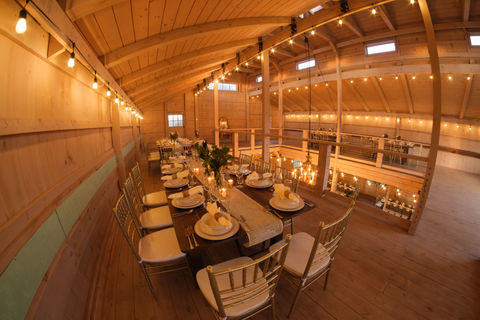 A beautiful chandelier that acts as the centerpiece to the event barn